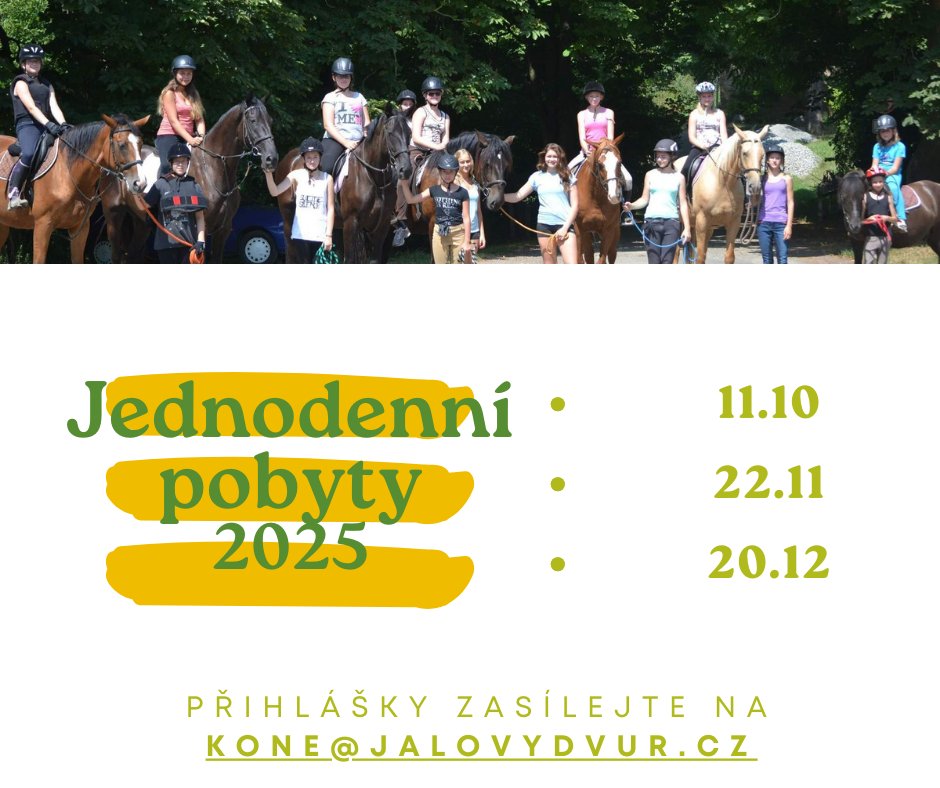 Kapacita pobytu je 12 dětí. Cena pobytu je 800 Kč. Přihlášky můžete posílat na email kone@jalovydvur.cz. ![]()